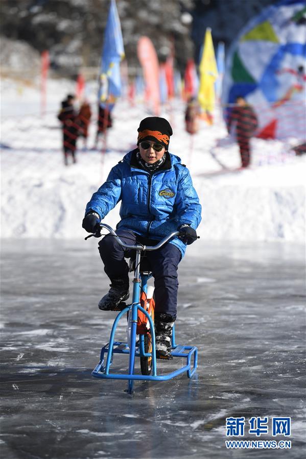 1月18日,游客在新疆天池景區(qū)玩冰上自行車。新華社記者 沙達提 攝