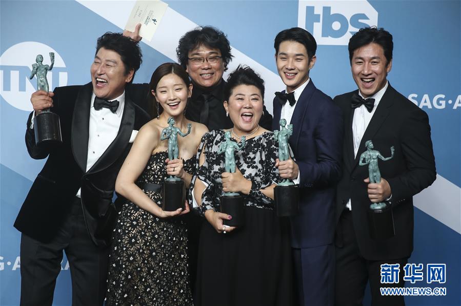 1月19日,在美國(guó)洛杉磯,韓國(guó)黑色喜劇片《寄生蟲》主創(chuàng)人員展示獎(jiǎng)杯。 新華社記者 李穎 攝