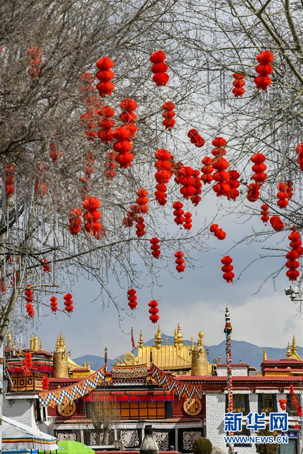 大昭寺外掛起紅燈籠(2月24日攝)。 新華社記者 普布扎西 攝