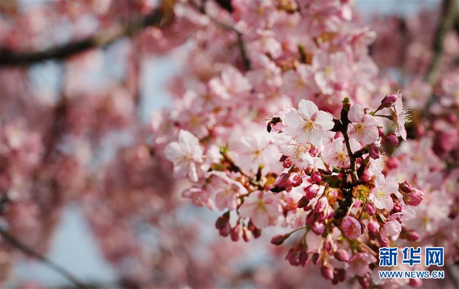 2月24日,蜜蜂在上海松江辰山植物園內(nèi)盛開的河津櫻櫻花叢中飛舞。近日,上海松江區(qū)辰山植物園內(nèi)的河津櫻絢麗綻放,花團錦簇間一派盎然春意。 新華社記者 方喆 攝