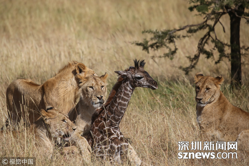 當(dāng)?shù)貢r(shí)間2018年8月15日,肯尼亞馬賽馬拉,當(dāng)?shù)貙?dǎo)游詹姆斯·納帕索(James Nampaso)拍攝到一群獅子圍攻母長頸鹿和她的幼崽。盡管長頸鹿勇敢地抵抗獅群的進(jìn)攻,但當(dāng)一頭母獅跳上它的脊背時(shí),它被分散了注意力,使得獅群最終捕獲了它的孩子。