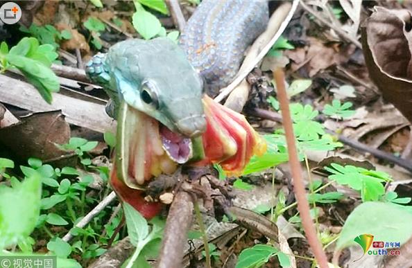 印度加爾各答B(yǎng)olpar,業(yè)余攝影師Agniswar Ghosal在Bolpar散步時(shí)拍到蛇大口吞咽蟾蜍的震撼場景。一條細(xì)長的蛇正試圖整個吞下一只大蟾蜍,蟾蜍的頭已經(jīng)進(jìn)了蛇口,大半截身體還在外邊。這條野心勃勃的蛇把這只毫無戒心的蟾蜍從洞里拖了出來,然后溜進(jìn)灌木叢,安靜地享用晚餐。