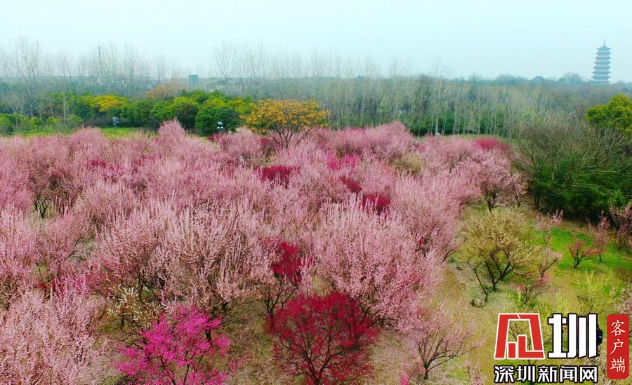 江蘇省揚(yáng)州市蜀岡西峰生態(tài)公園內(nèi)梅花競(jìng)相綻放,五顏六色的梅花樹為古城大地披上七彩春裝,美不勝收。