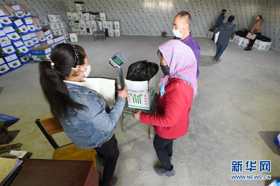 3月4日,在靖遠(yuǎn)縣北灣鎮(zhèn),農(nóng)民將黃瓜稱重裝箱。新華社記者 范培珅 攝