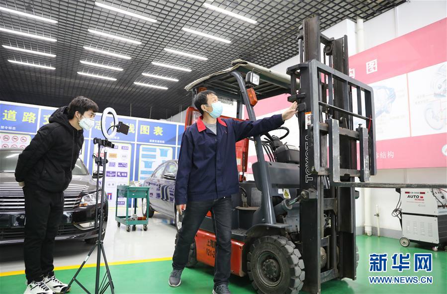 3月4日,職教城內的鞍山市交通運輸學校的楊永祥老師(右)為學生進行物流叉車實訓網絡授課。遼寧省鞍山市職教城內的各類職業(yè)教育學校從3月2日恢復網絡授課以來,教師們設置了豐富多彩的課程,提高1萬余名學生線上學習的積極性。新華社記者 姚劍鋒 攝
