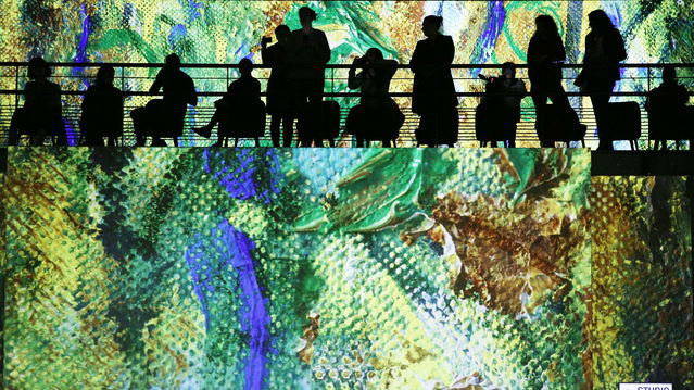 2月27日,在法國巴黎,人們?cè)凇稄哪巍⒗字Z阿到夏加爾:地中海之旅》光影藝術(shù)沉浸展的媒體預(yù)展上參觀。新華社記者高靜攝