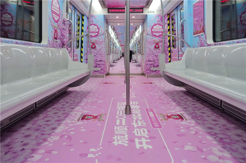 2018年4月3日,遼寧大連,伴隨濃濃春意,大連地鐵1號(hào)線、2號(hào)線、3號(hào)線、12號(hào)線櫻花專列同步上線,其中1號(hào)線為全景包列。櫻花專列車(chē)廂以粉色櫻花為基調(diào),沿枝椏延伸出的片片云霞,呈現(xiàn)春日花開(kāi)意境,傳遞出北國(guó)之春的韻律。南宮傲青/視覺(jué)中國(guó)