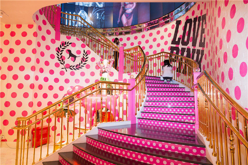 2018年5月17日,北京王府井維密旗艦店。店內(nèi)旋梯很漂亮,上下一共3層,1、2層巨大的環(huán)形電視墻,播放著維密超模走秀的視頻,地下一層粉嫩的風(fēng)格粉嫩,充滿了少女心。劉鋒/千龍圖像/視覺(jué)中國(guó)