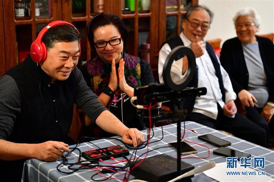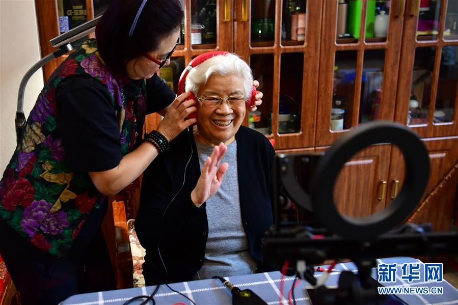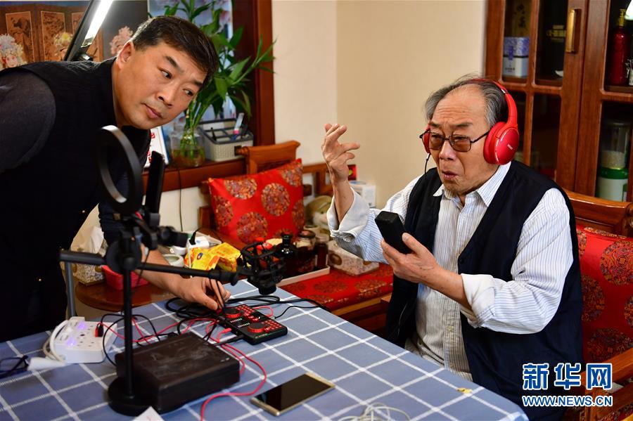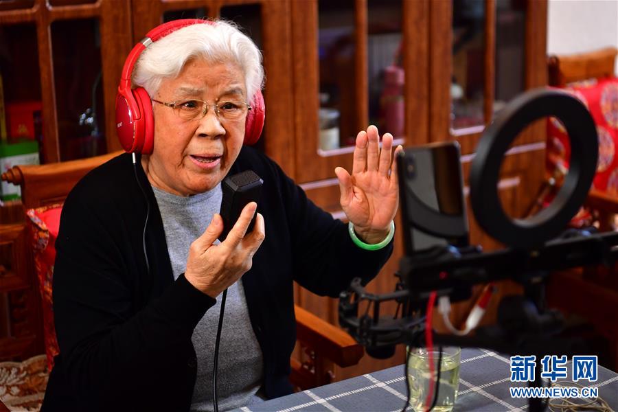 閻惠貞(右)在和直播平臺的戲迷打招呼(3月6日攝)。 新華社記者 曹陽 攝