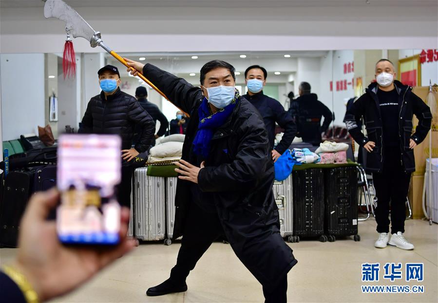 太原市晉劇藝術(shù)研究院的工作人員在為戲迷直播武凌云(左二)排練晉?。?月9日攝)。 新華社記者 曹陽 攝