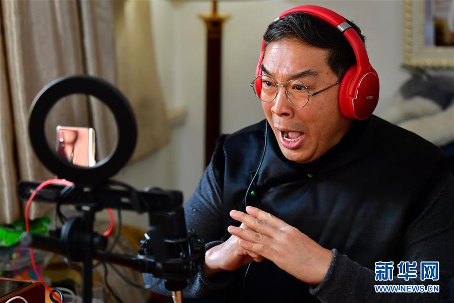 武凌云在直播中演唱晉劇片段(3月5日攝)。 新華社記者 曹陽 攝