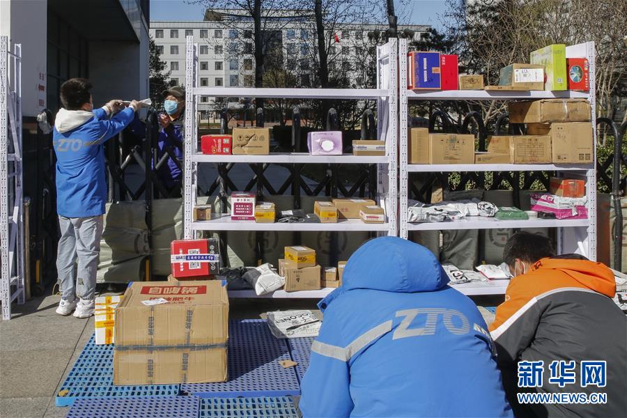 3月12日,李杰(左一)在中國青年政治學(xué)院快遞點(diǎn)隔著柵欄給客戶遞送包裹。新華社記者張玉薇攝