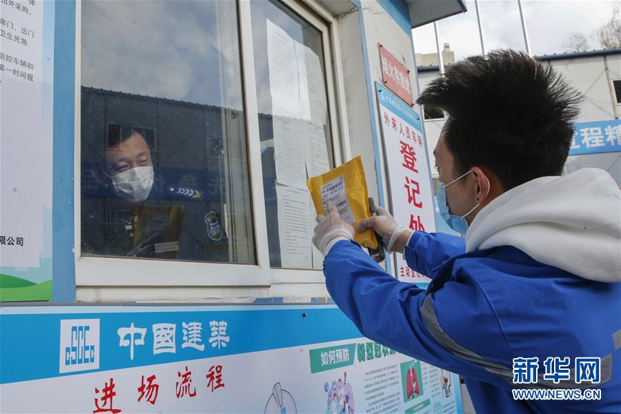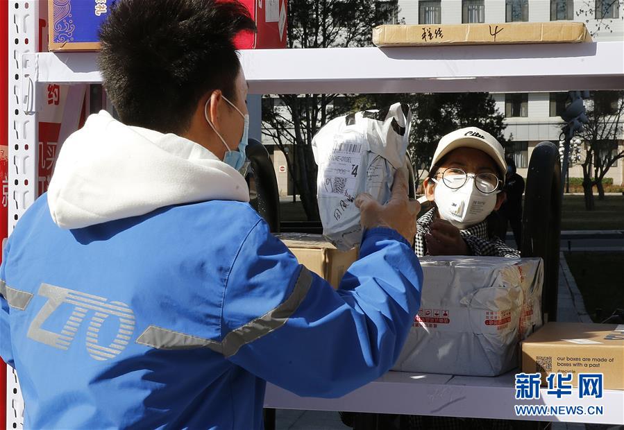 3月12日,李杰(左)在中國青年政治學(xué)院快遞點(diǎn)隔著柵欄給客戶遞送包裹。新華社記者張玉薇攝