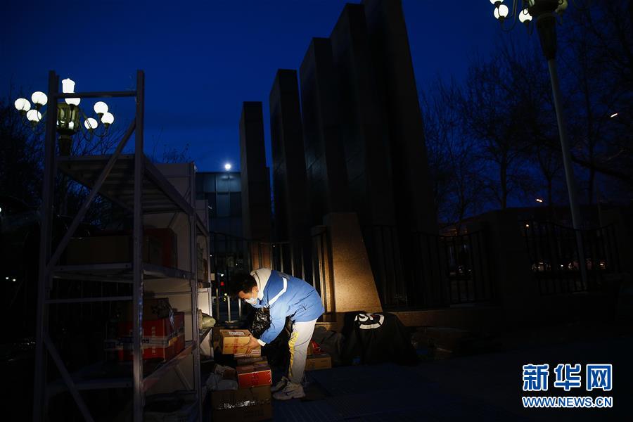 3月12日,李杰在中國青年政治學院快遞點查看仍未領取的包裹。新華社記者張玉薇攝