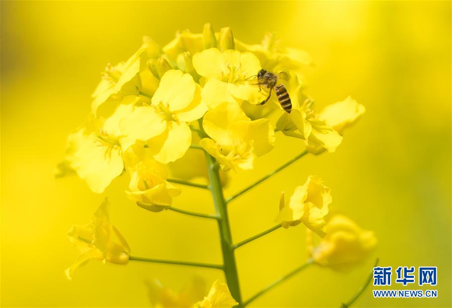 3月14日,在武漢市西北部市郊,蜜蜂在油菜花上采蜜。隨著氣溫升高,春意在武漢的枝頭上萌動(dòng),花朵漸次開(kāi)放。新華社記者肖藝九攝