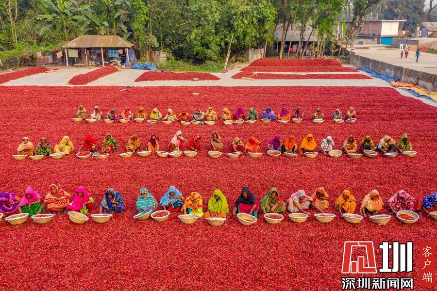 孟加拉國伯格拉,航拍穿著五顏六色衣服的工人們排列整齊的分揀辣椒。