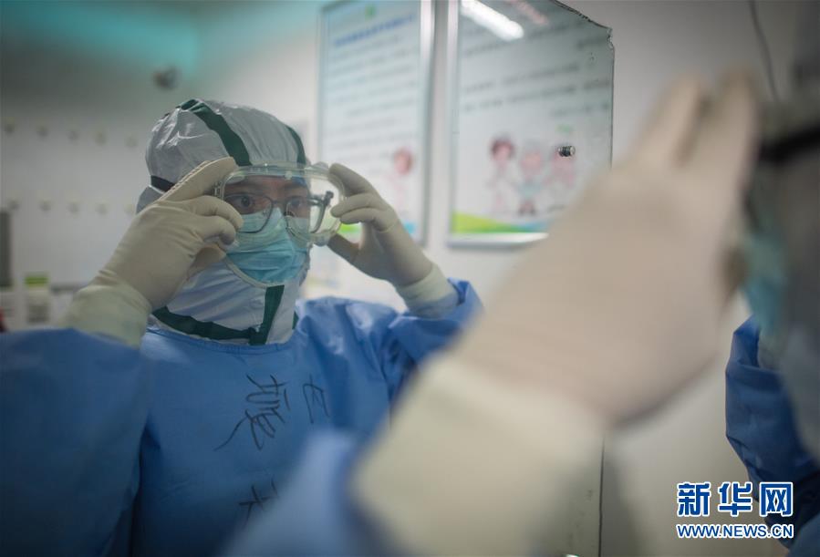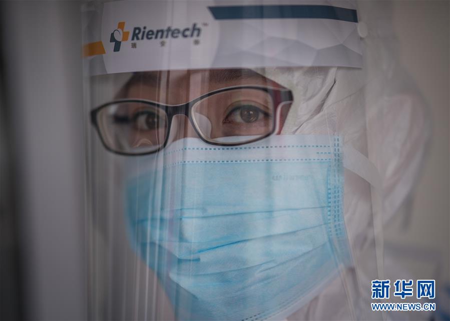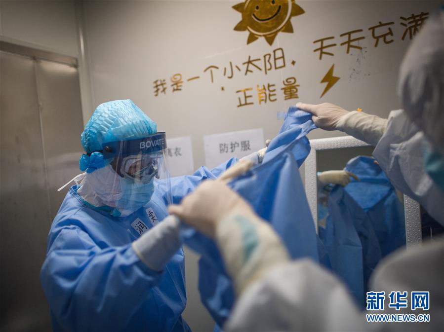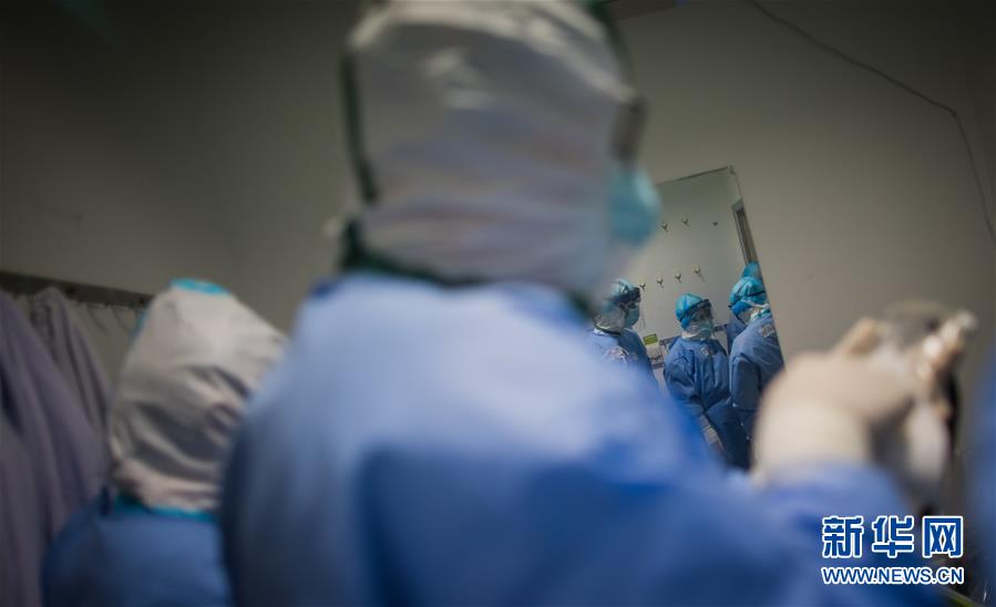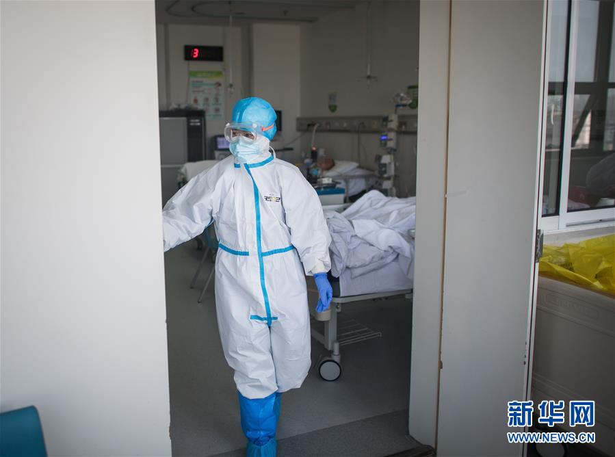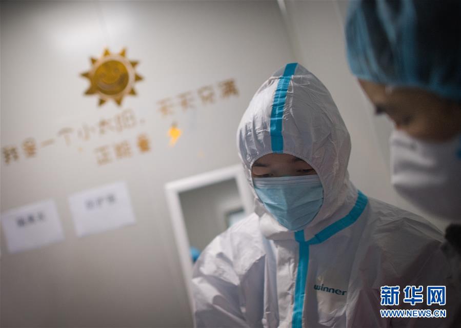 3月19日,在武漢市肺科醫(yī)院隔離病房,海南醫(yī)療隊(duì)隊(duì)員詹才露在現(xiàn)場(chǎng)忙碌。  新華社記者 肖藝九 攝