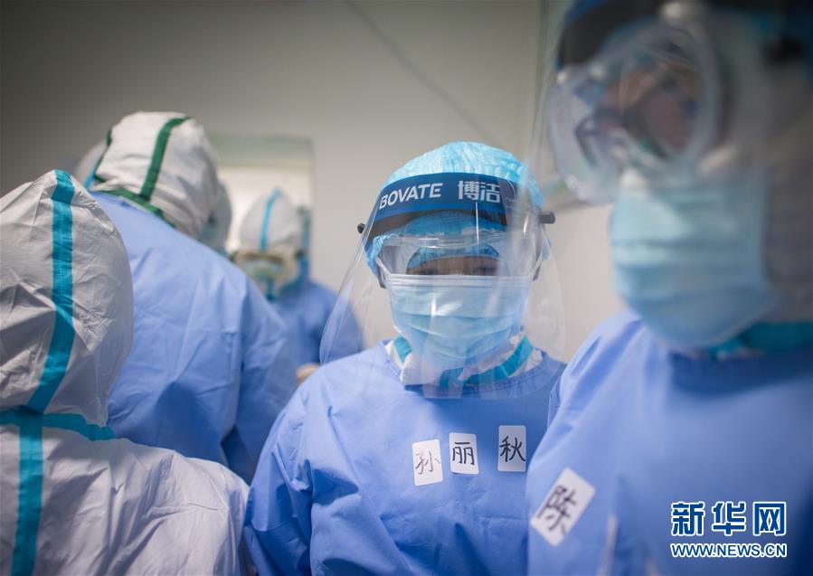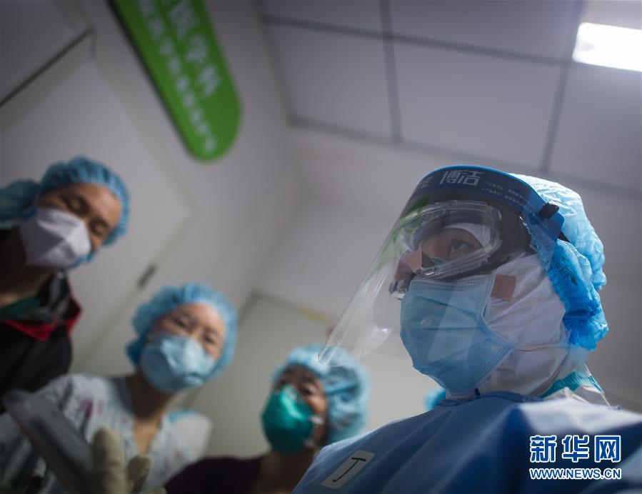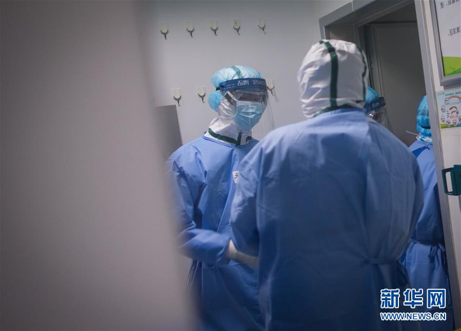 3月19日,在武漢市肺科醫(yī)院隔離病房,海南醫(yī)療隊(duì)隊(duì)員在現(xiàn)場(chǎng)忙碌。  新華社記者 肖藝九 攝