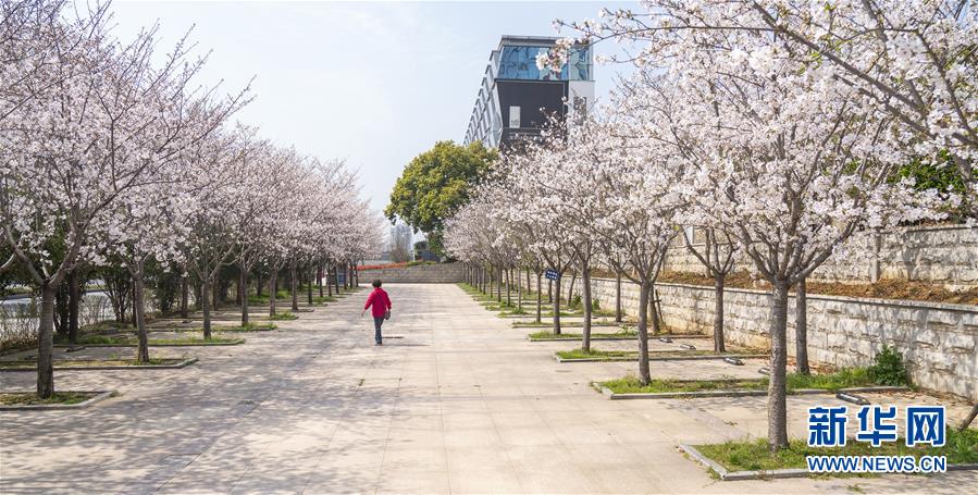 3月19日,在武漢市武昌區(qū)被網(wǎng)友稱為“武漢最美停車場”的湖北日報停車場,一名工作人員從櫻花樹邊經(jīng)過。 新華社記者 才揚 攝