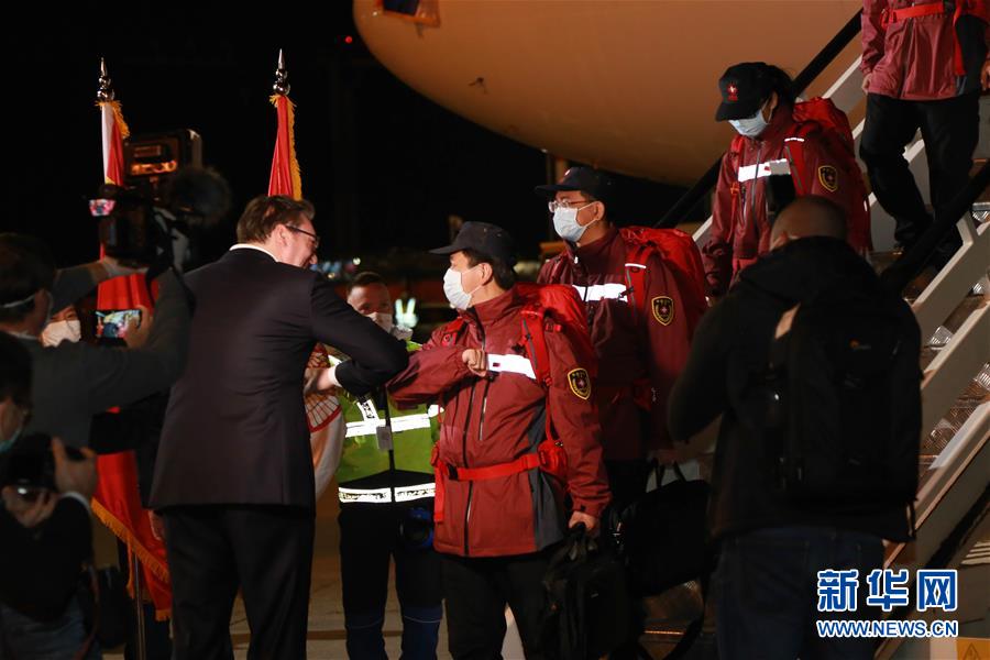 3月21日,在塞爾維亞首都貝爾格萊德,前來迎接的塞爾維亞總統(tǒng)武契奇(左)與中國援助塞爾維亞抗疫醫(yī)療專家組成員“碰肘”致意。 中國援助塞爾維亞抗疫醫(yī)療專家組一行6人21日晚乘專機(jī)抵達(dá)塞首都貝爾格萊德,由中國政府捐贈(zèng)的一批醫(yī)療物資同機(jī)抵達(dá)。 新華社記者 石中玉 攝