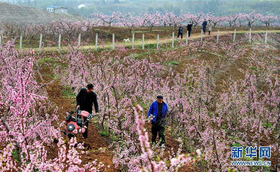 3月22日,龍亭鎮(zhèn)柳山村村民(前)在桃園中春耕。陽春三月,陜西省漢中市洋縣龍亭鎮(zhèn)柳山村,1300畝桃園的花朵綻放。新華社記者陶明攝