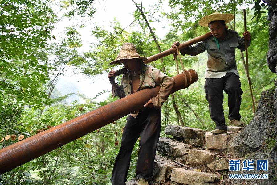 在廣西大化瑤族自治縣板升鄉(xiāng)弄雷村,工人們抬著抗旱飲水工程的水管在山路上前行(2016年8月10日攝)。廣西有近一半貧困人口生活在石漠化地區(qū),涉及數(shù)十個(gè)縣區(qū)。這里也是廣西飲水保障程度最低的地區(qū),解決貧困人口飲水問題是廣西脫貧攻堅(jiān)戰(zhàn)“硬仗中的硬仗”?!笆濉币詠恚瑥V西加快實(shí)施農(nóng)村飲水安全鞏固提升工程。因地制宜,采取新建、擴(kuò)建及管網(wǎng)延伸等多種措施,補(bǔ)齊貧困地區(qū)水利薄弱短板,進(jìn)一步提升石漠化地區(qū)群眾飲水安全保障水平,助推脫貧攻堅(jiān)。新華社記者黃孝邦攝