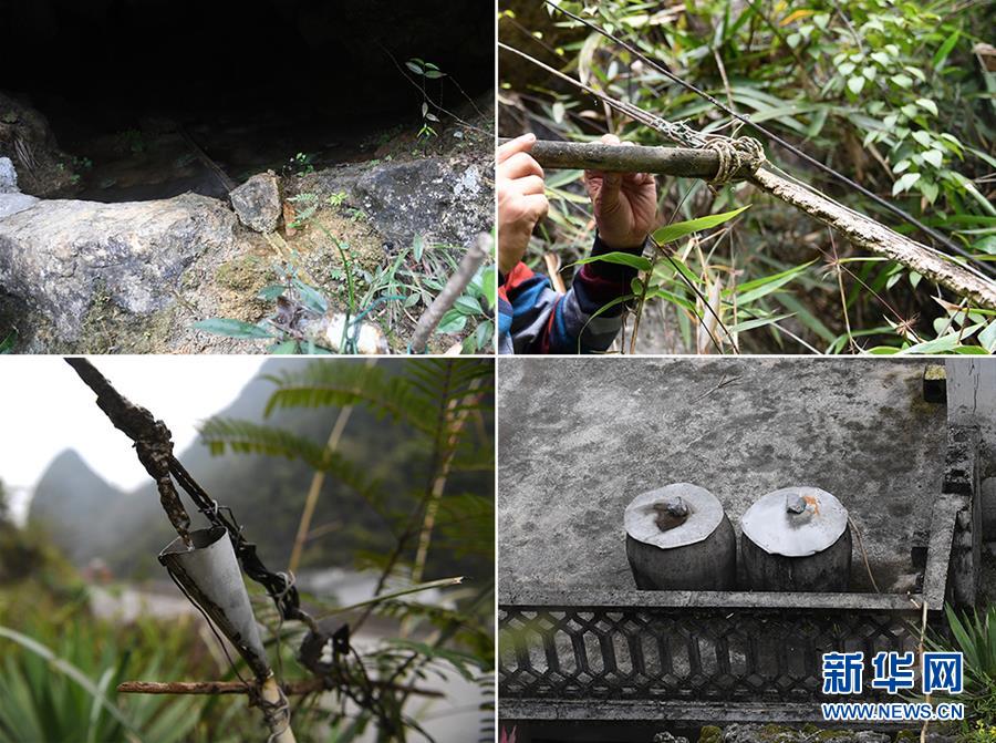 這張拼版圖片顯示廣西都安瑤族自治縣澄江鎮(zhèn)自成村加倫屯村民黃景飛獨創(chuàng)的“鐵線引水”法(2018年3月16日攝)。左上圖為竹枧將山泉水從山洞引出;右上圖為竹枧將山泉水引到鐵線上;左下圖為一個特制的漏斗將水接入膠管里;右下圖為膠管將山泉水送到水缸里。廣西有近一半貧困人口生活在石漠化地區(qū),涉及數十個縣區(qū)。這里也是廣西飲水保障程度最低的地區(qū),解決貧困人口飲水問題是廣西脫貧攻堅戰(zhàn)“硬仗中的硬仗”?!笆濉币詠恚瑥V西加快實施農村飲水安全鞏固提升工程。因地制宜,采取新建、擴建及管網延伸等多種措施,補齊貧困地區(qū)水利薄弱短板,進一步提升石漠化地區(qū)群眾飲水安全保障水平,助推脫貧攻堅。新華社記者陸波岸攝