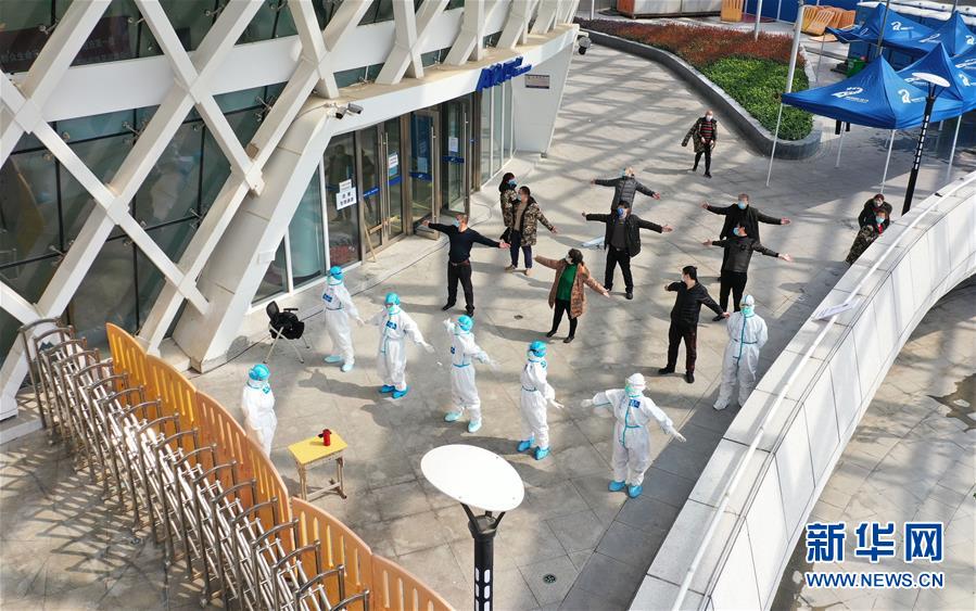3月10日,在武漢江夏方艙醫(yī)院,醫(yī)護人員教患者練習八段錦(無人機照片)。新華社記者才揚攝
