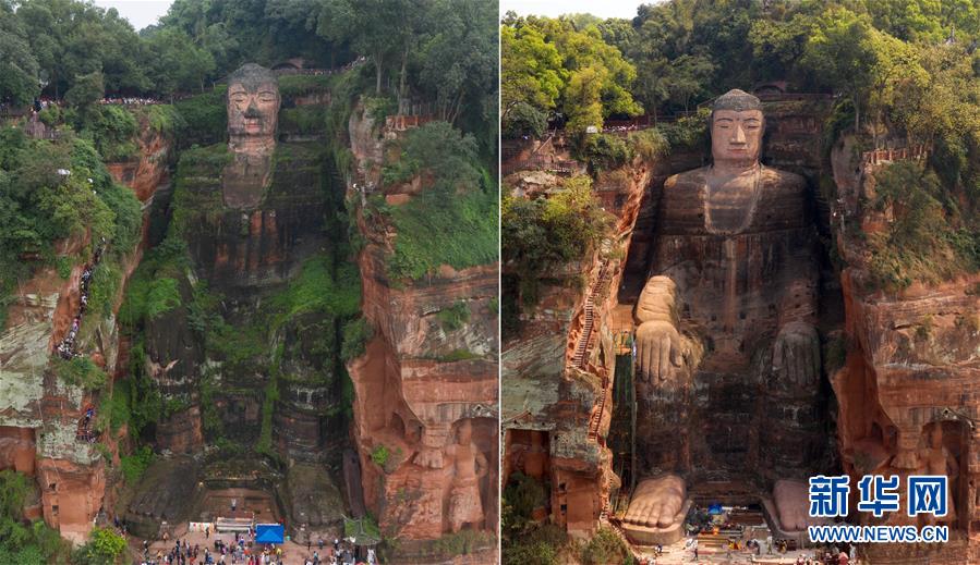 這是一張拼版照片:左圖為體檢與搶救性修復(fù)工作前的樂(lè)山大佛(2018年10月4日無(wú)人機(jī)拍攝);右圖為體檢與搶救性修復(fù)工作后的樂(lè)山大佛(3月29日無(wú)人機(jī)拍攝)。新華社記者江宏景攝