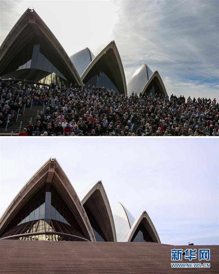 拼版照片顯示:(上)2019年6月14日,大量市民坐在澳大利亞悉尼歌劇院前的臺(tái)階上。(下)2020年3月24日,澳大利亞悉尼歌劇院前的臺(tái)階上空空蕩蕩。澳大利亞從當(dāng)?shù)貢r(shí)間3月23日中午起,關(guān)閉影院、室內(nèi)體育館、健身房等文體娛樂(lè)場(chǎng)所,飯店和咖啡館只允許外賣業(yè)務(wù)。 新華社記者 白雪飛 攝