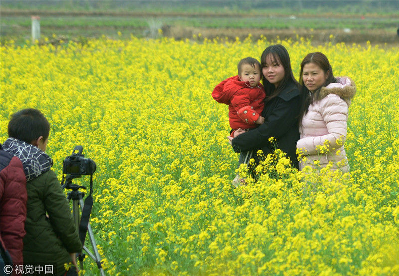 2019年2月5日,廣西來(lái)賓,當(dāng)天是農(nóng)歷大年初一,人們?cè)谛贸强h城關(guān)鎮(zhèn)隆光村油菜花海中賞花游玩。