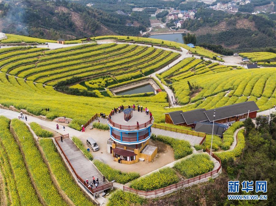 3月25日,游客在新登鎮(zhèn)上旺村黑山頂觀景臺觀賞油菜花海(無人機(jī)照片)。新華社記者徐昱攝