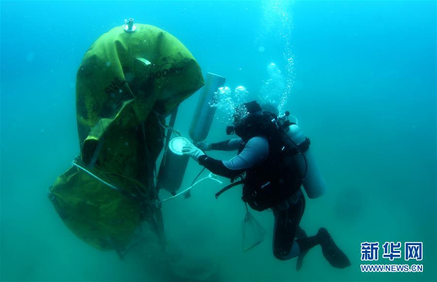 在位于海南三亞蜈支洲島旅游區(qū)的海洋牧場,工作人員在為浮力袋充氣后,浮力袋帶著固定好的人工魚礁上?。?月27日攝)。近日,位于海南三亞蜈支洲島旅游區(qū)的海洋牧場復(fù)工,海底作業(yè)逐漸恢復(fù)正常,開始進(jìn)行人工魚礁吊裝擺位、水下監(jiān)控清理以及日常巡護(hù)等工作。據(jù)介紹,人工魚礁有利于魚類種類增加和數(shù)量提高,蜈支洲島海域海洋牧場人工魚礁表面附著珊瑚、貝類、藻類等生物種類達(dá)120余種。新華社記者楊冠宇攝