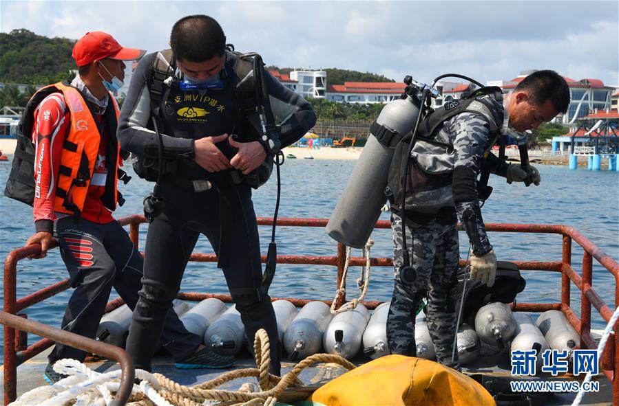 在位于海南三亞蜈支洲島旅游區(qū)的海洋牧場,工作人員在船上穿戴裝備,準(zhǔn)備下海作業(yè)(3月27日攝)。近日,位于海南三亞蜈支洲島旅游區(qū)的海洋牧場復(fù)工,海底作業(yè)逐漸恢復(fù)正常,開始進(jìn)行人工魚礁吊裝擺位、水下監(jiān)控清理以及日常巡護(hù)等工作。據(jù)介紹,人工魚礁有利于魚類種類增加和數(shù)量提高,蜈支洲島海域海洋牧場人工魚礁表面附著珊瑚、貝類、藻類等生物種類達(dá)120余種。新華社記者楊冠宇攝