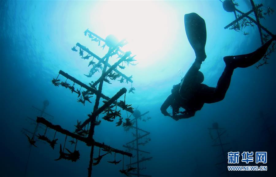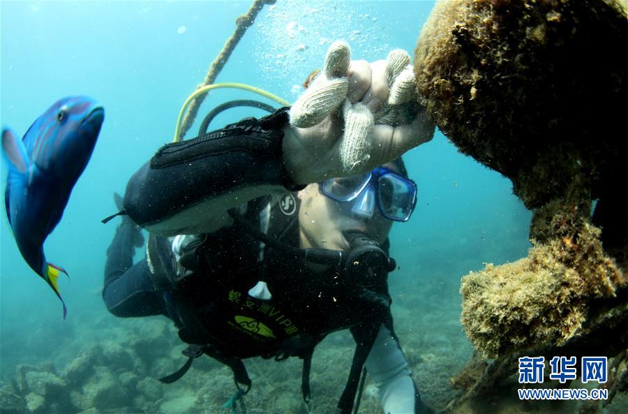 3月28日,在位于海南三亞蜈支洲島旅游區(qū)的海洋牧場,工作人員在清理附著在珊瑚上的漁網(wǎng)。近日,位于海南三亞蜈支洲島旅游區(qū)的海洋牧場復(fù)工,海底作業(yè)逐漸恢復(fù)正常,開始進(jìn)行人工魚礁吊裝擺位、水下監(jiān)控清理以及日常巡護(hù)等工作。據(jù)介紹,人工魚礁有利于魚類種類增加和數(shù)量提高,蜈支洲島海域海洋牧場人工魚礁表面附著珊瑚、貝類、藻類等生物種類達(dá)120余種。新華社記者楊冠宇攝