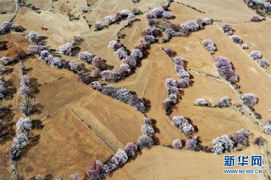 西藏林芝市波密縣境內(nèi)桃花盛開的田園風(fēng)光(無人機照片,3月26日攝)。新華社記者 詹彥 攝