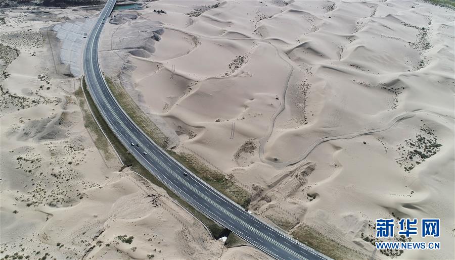 汽車行駛在第一條沙漠公路上(6月12日無人機拍攝)。新華社記者趙戈攝