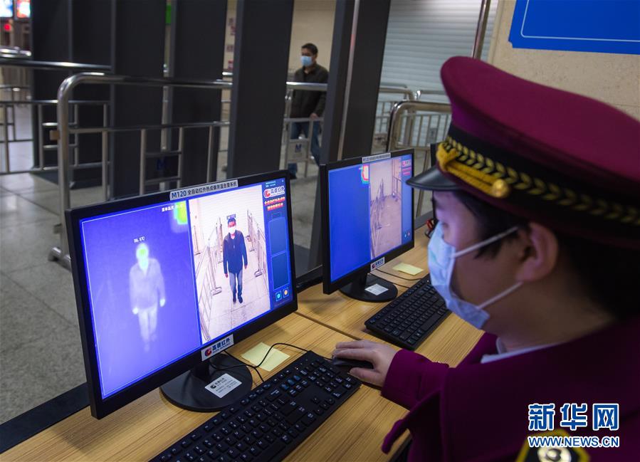 3月23日,在漢口火車站地鐵站,工作人員在測(cè)試測(cè)溫系統(tǒng)。該車站的2個(gè)入口處,已經(jīng)安裝了電子測(cè)溫儀器,只要有乘客通過(guò),就會(huì)在電腦顯示屏上出現(xiàn)體溫的數(shù)據(jù),監(jiān)控進(jìn)站乘客體溫。新華社記者肖藝九攝