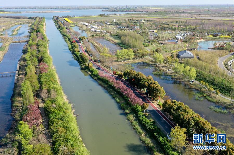 這是4月5日拍攝的白馬湖畔春日景象(無人機(jī)照片)。 新華社記者 楊磊 攝