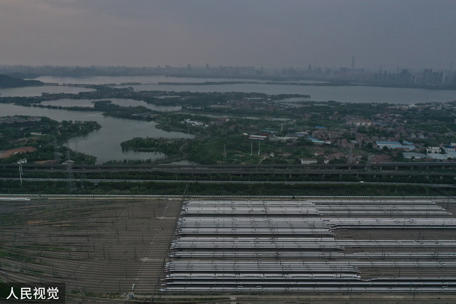 2020年4月6日,武漢動(dòng)車段高鐵動(dòng)車組整裝待發(fā)(無人機(jī)照片)。