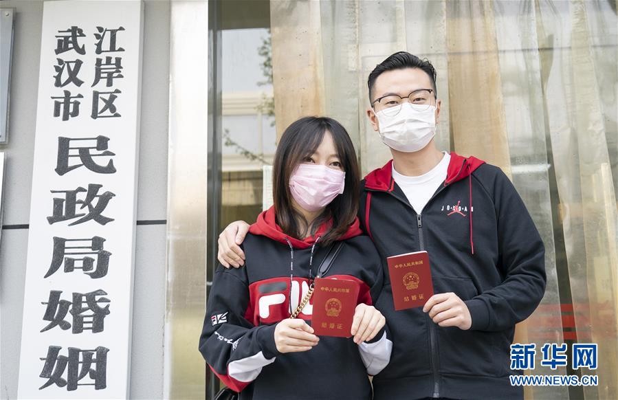 4月7日,在武漢市江岸區(qū)民政局婚姻登記處,陳先生與張女士展示結(jié)婚證。4月3日起,武漢市婚姻登記機構(gòu)陸續(xù)恢復(fù)辦理婚姻登記業(yè)務(wù)?;橐霎斒氯诵璩志G色健康碼預(yù)約登記,分批分時辦理。 新華社記者才揚攝