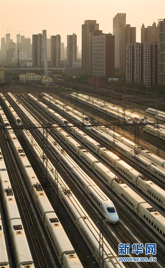 4月7日,在武漢動車段,列車停靠在存車線上(無人機照片)。 新華社記者 肖藝九 攝