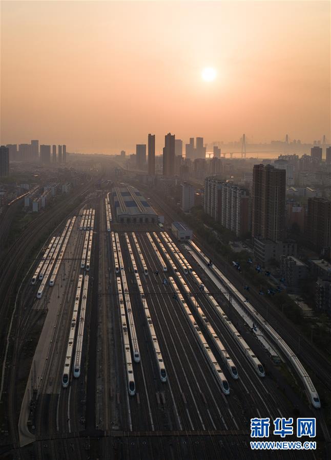 4月8日,在武漢動車段,列車??吭诖孳嚲€上準(zhǔn)備投入運行(無人機照片)。當(dāng)日,武漢市正式解除離漢離鄂通道管控措施,幾十組在武漢動車段經(jīng)過檢修消殺的動車組,猶如“陸地艦隊”停靠在存車線上,蓄勢待發(fā),重新啟程。 新華社記者 肖藝九 攝