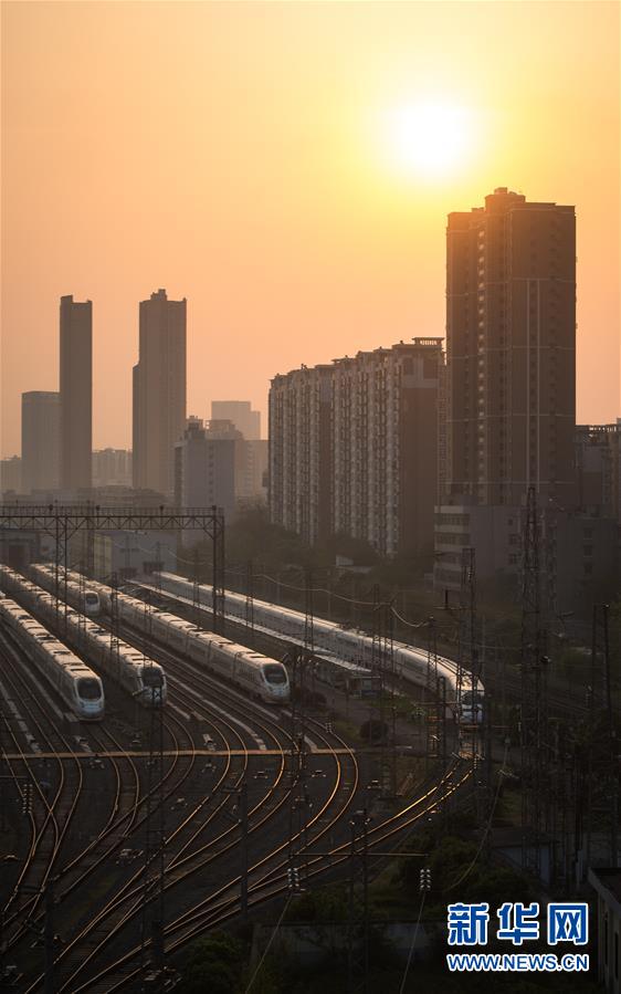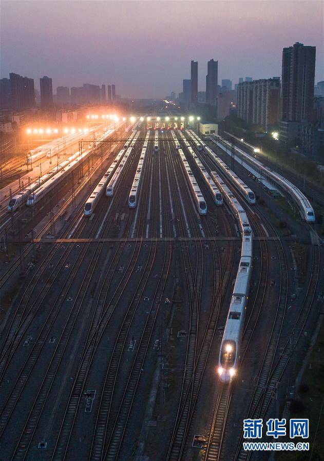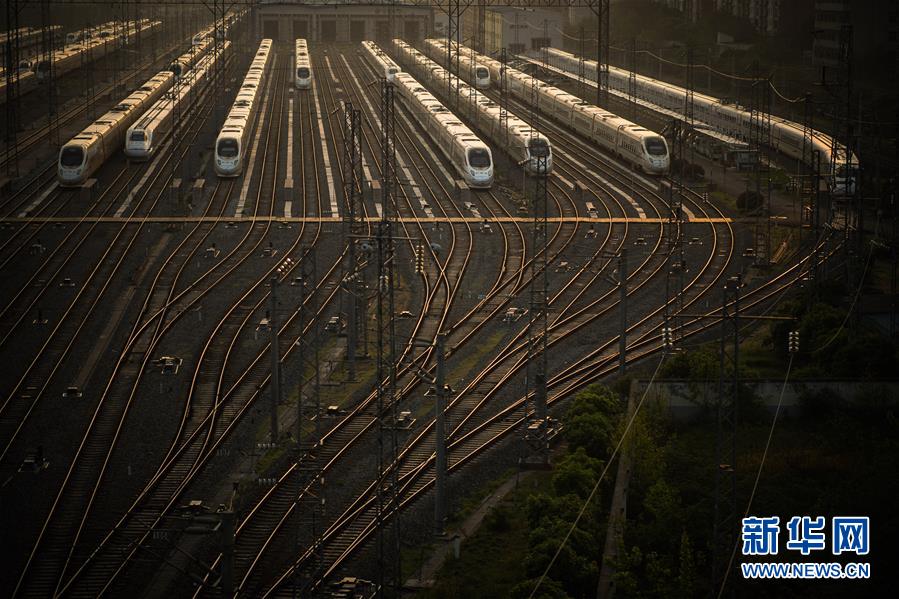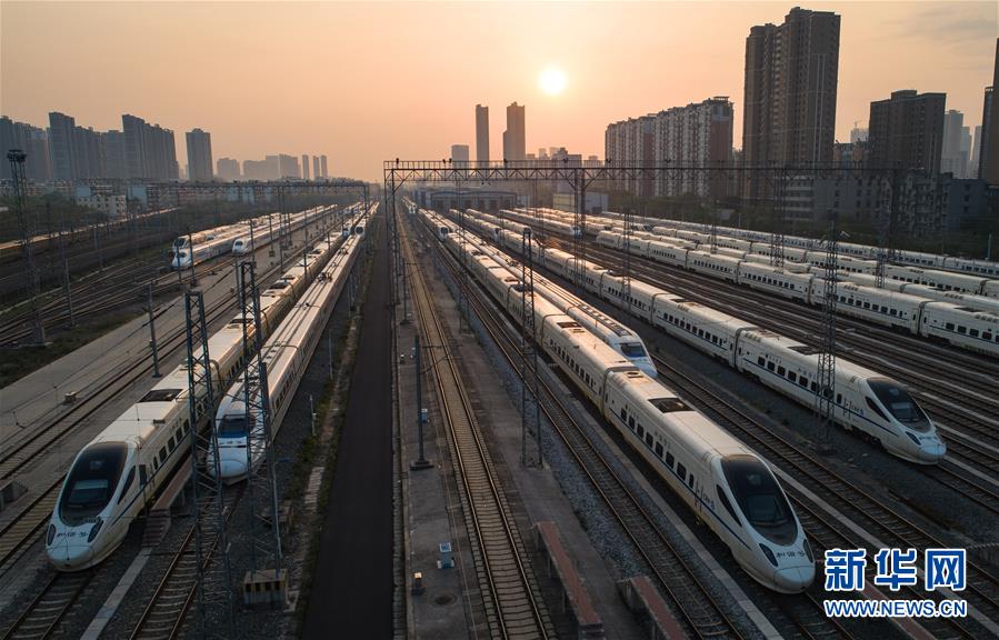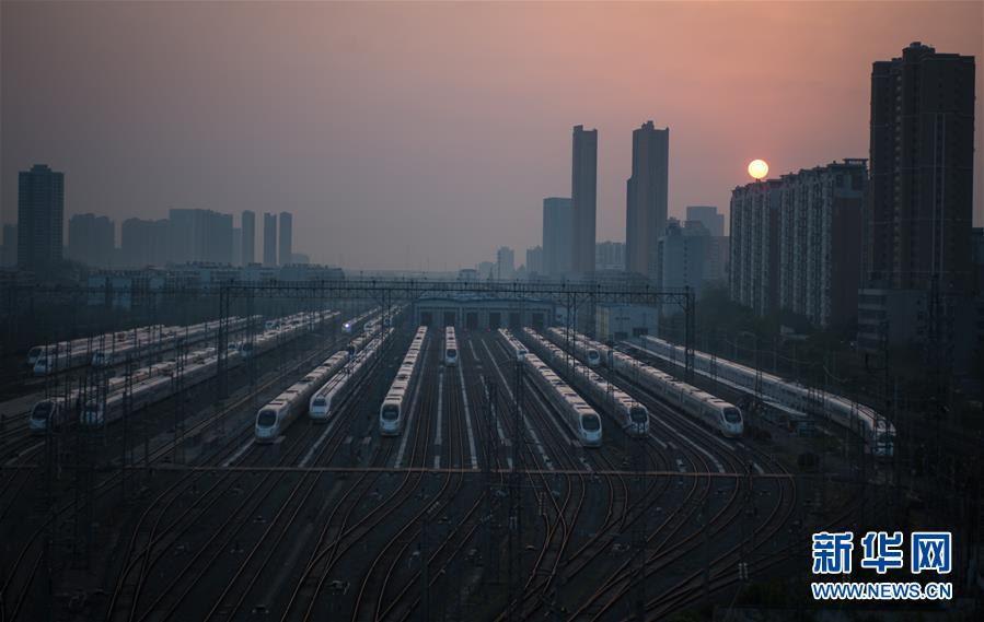 4月8日,在武漢動(dòng)車(chē)段,列車(chē)??吭诖孳?chē)線上準(zhǔn)備投入運(yùn)行。 新華社記者 肖藝九 攝