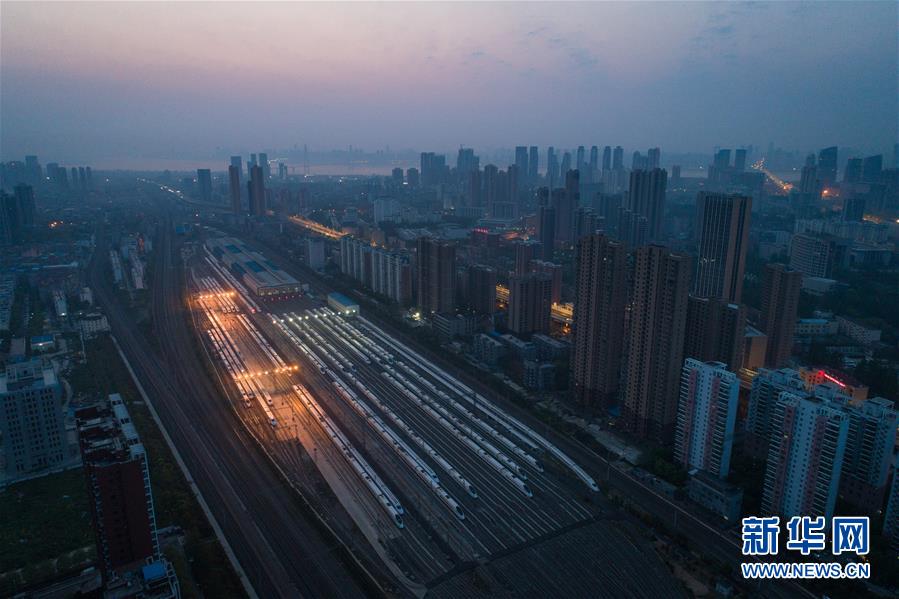 4月8日,在武漢動(dòng)車(chē)段,列車(chē)停靠在存車(chē)線上準(zhǔn)備投入運(yùn)行(無(wú)人機(jī)照片)。 新華社記者 肖藝九 攝