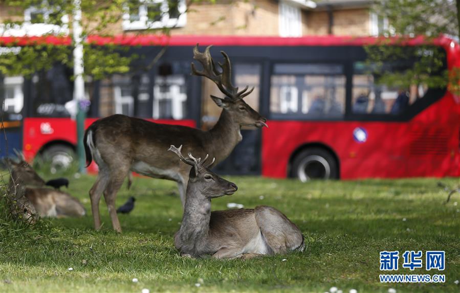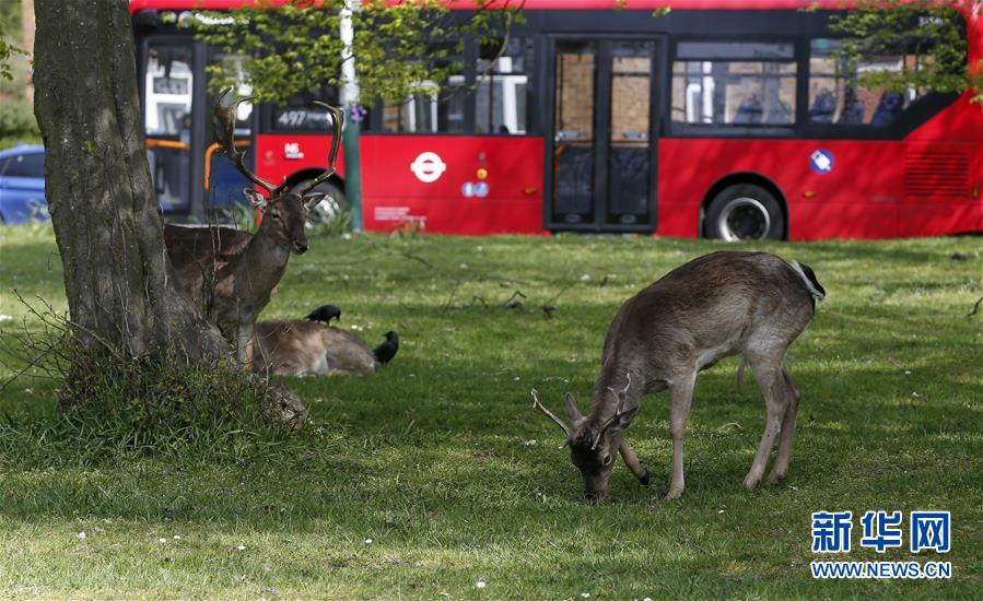 4月8日,在英國(guó)倫敦東部一個(gè)居民區(qū),附近公園里的鹿在草坪上駐足。隨著新冠疫情在英國(guó)的擴(kuò)散,政府要求人們減少不必要的外出。倫敦東部一個(gè)居民區(qū)附近公園里原來(lái)散養(yǎng)的鹿紛紛從公園走出來(lái),或吃草或接受附近居民的喂食,成為特殊時(shí)期居民區(qū)里的新“客人”。新華社記者韓巖攝