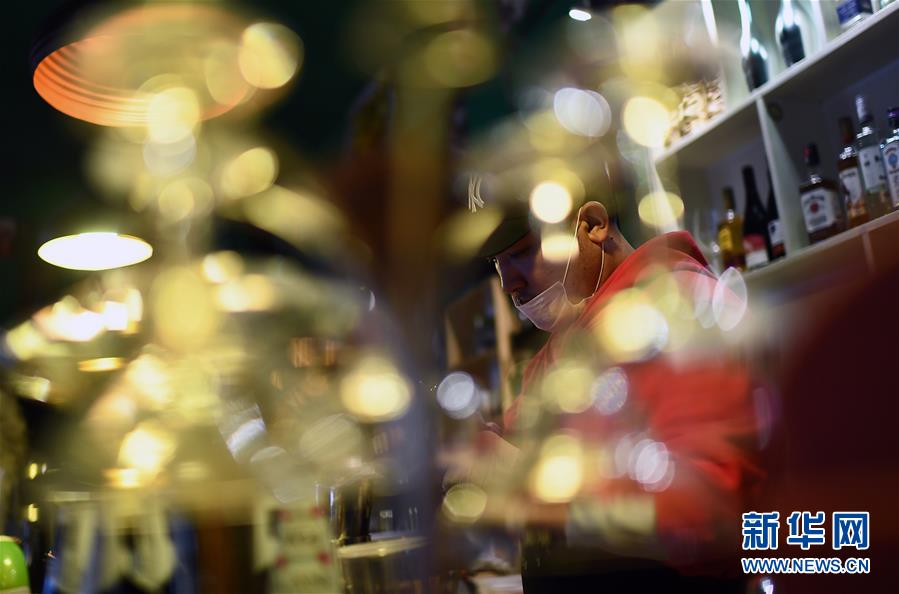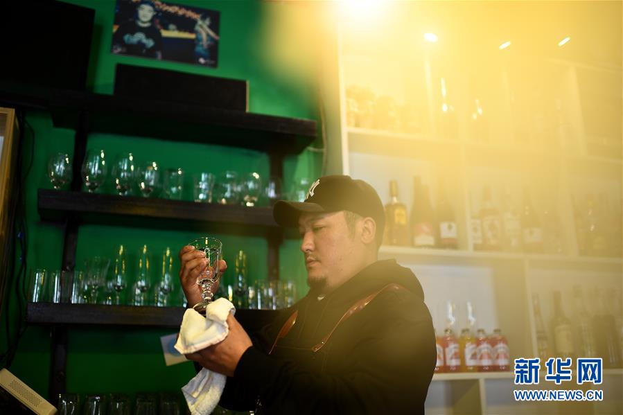 4月8日,才仁俄賽在餐廳內調酒。新華社記者張宏祥攝