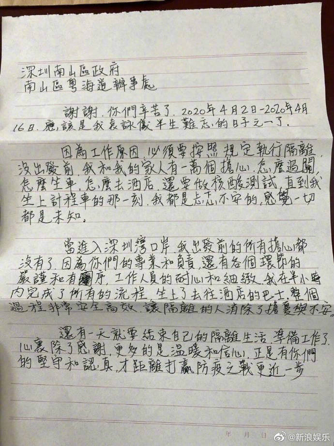 記者了解到,4月2日,袁詠儀因?yàn)楣ぷ髟?,從香港來到深圳,按?guī)定要到酒店隔離至16日。這段隔離的日子,她表示這是“半生中難忘的日子之一”了。4月15日,她即將結(jié)束隔離,為對這期間辛苦的工作人員表示感謝,她寫了一封信向南山區(qū)政府和“網(wǎng)紅街道”粵海街道辦事處致謝,回憶了當(dāng)時(shí)在深圳灣口岸半小時(shí)就完成所有流程、前往酒店隔離的過程,點(diǎn)贊了深圳政府一系列安全高效的隔離措施。