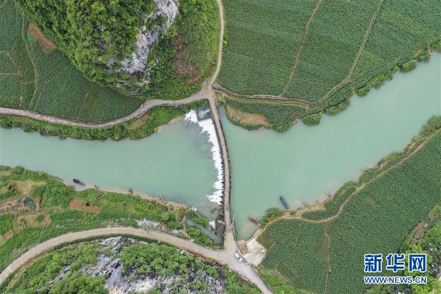 4月23日,在廣西隆安縣南圩鎮(zhèn),農(nóng)人趕著牲畜走過(guò)一座小橋(無(wú)人機(jī)照片)。新華社記者周華攝