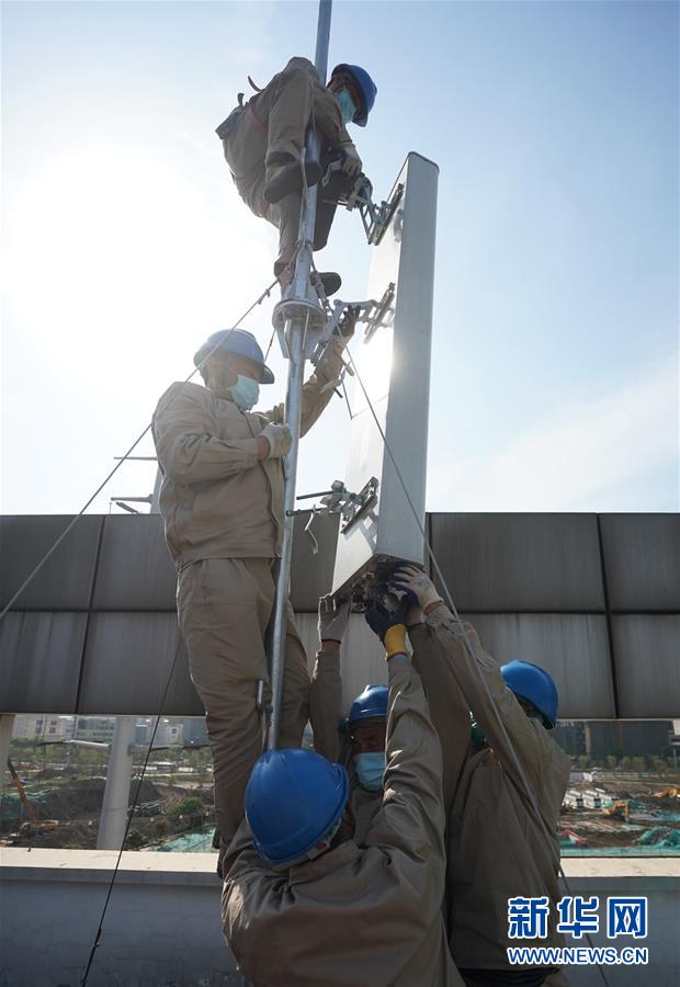 4月25日,在南京220千伏城南河變電站屋頂,工人在架設(shè)4G設(shè)備。當(dāng)日,三大通信運營商的2座5G、3座4G基站建設(shè)工作在南京220千伏城南河變電站屋頂有序展開。在變電站內(nèi)建設(shè)基站可有效利用電網(wǎng)資源,縮短建設(shè)周期,節(jié)約建設(shè)成本。新華社記者季春鵬攝